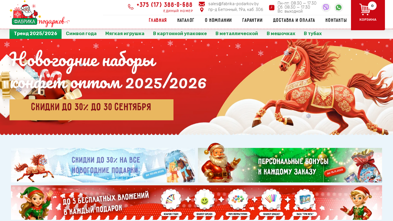 | SEO-описание | 🎁 Заказывайте новогодние сладкие подарки 2025-2026 из конфет для детей в Минске оптом в компании «Фабрика подарков»! 🎁 Доставка по всей Беларуси! 🎁 Большой ассортимент в разных ценовых диапазонах! ☎ Звоните: +375 (17) 388-0-688! |
