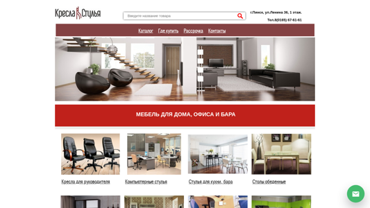 | AI-анализ | The website is an e-commerce platform for furniture and home appliances in Pinsk, Belarus. The title of the website is "Кресла стулья пинск, купить мебель в пинске - Кресла стулья" and the description mentions various product categories such as "Мебель ДЛЯ ДОМА, ОФИСА И БАРА" and specific brands like "EVERPROF" and "Бонд". Keywords include "кресла", "стулья", "мебель", "купить", and "пинск". The catalog section includes a list of items for sale, including computer desks, kitchen tables, cabinets, and various types of chairs. The contact information for the business is provided, including the location in Pinsk on Lenin Street and the phone number. The website also |