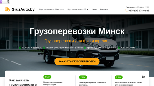 | AI-анализ | The portal GruzAuto.by offers cargo transportation services in Minsk and other related services from 8:00-22:00 for up to 3 tons and 20 cubic meters. Prices, reviews, and contacts are provided. The company handles cargo with the help of laborers for weights ranging from 1 kg to 3 tons. The title includes the words 'cheap transportation services from Minsk for 45 rubles per hour'. The website contains sections for 'Cargo transportation in Minsk', 'Cargo transportation across Belarus', and 'Contacts'. Services offered include cargo transportation, moving household items, vehicle transport, and cargo transport using a hydroborter. The company also provides cargo transportation from the Minsk airport. The website provides a phone number for contact and booking. |