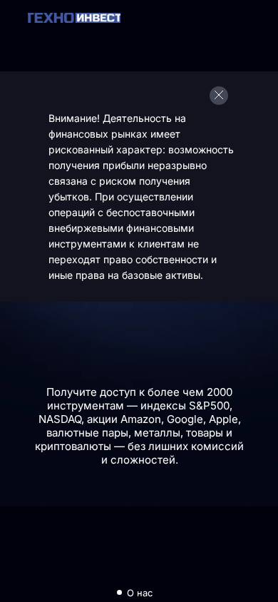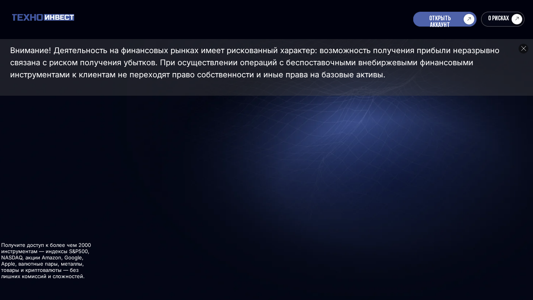 | AI-анализ | The website Technoinvest.by is a Belarusian investment service platform offering access to over 2000 financial instruments including indices S&P500, NASDAQ, stocks of Amazon, Google, Apple, currency pairs, metals, commodities, and cryptocurrencies, without additional commissions or complications. The platform grants access to all financial markets, providing a technology-based solution. Investing in financial markets carries a risky nature: the potential for profit is inseparable from the risk of loss. Clients do not acquire ownership or other rights to the underlying assets when trading with over-the-counter unregulated financial instruments. To open an account, learn about the risks, benefits, and account types. Technoinvest Group OOO is part of the banking holding company OAO "Technobank." The platform offers various payment methods, a low entry threshold with |