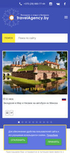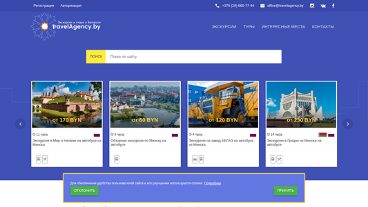 | AI-анализ | The web project "TravelAgency.by" is a Belarusian tour operator, specializing in vacations and excursions in Belarus. The company offers various types of tours and excursions including corporate, individual, and school trips. The website provides information on different tours, their duration, and costs. Some popular options include a 4.5-hour excursion to Dudutki from Minsk for 120 BYN, a 2.5-hour evening tour of Minsk for 85 BYN, and a 13.5-hour visit to the Khatyn memorial complex for 205 BYN. The website also offers tours to various places in Belarus such as Mir, Nesvizh, and Grodno. |