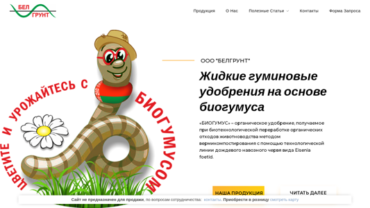 | AI-анализ | This online resource offers organic liquid fertilizers based on biohumus and extract of sapropel. The company, OOO "БЕЛГРУНТ," produces these fertilizers using biotechnological processing of livestock waste through vermicomposting with the help of a rainwater earthworm line of Eisenia fetid. The product line includes both BioHumus and Extract of Sapropel. The BioHumus is an organic fertilizer obtained through this method, while the Extract of Sapropel is a natural supplement sourced from the bottom of Belarusian lakes. The fertilizers are compatible with all organic fertilizers. The product page includes product information, methods and guidelines, reports on testing, and contact information. The site offers a form for inquiries, and pricing information for the 500 ml (pack of 8 |