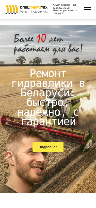 | AI-анализ | language: en This online resource, titled "Ремонт гидравлики в Беларуси | СпецГiдроТех - от 3 дней" (Repair of hydraulics in Belarus | Specialized HydroTechnology - within 3 days), is a website dedicated to repair services for various hydraulic components. The website offers professional repair of hydropumps, hydromotors, and hydrocylinders in Minsk, Belarus. The company has 15 years of experience and provides a warranty of up to 12 months. The contact information for the service department is +375 (29) 303-39-39, and the address is given as ул. Бабушкина, 76. The website provides services for the repair of hydraulic |