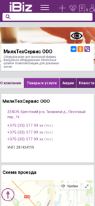 AI-анализ | The portal MilkTechService OOO offers equipment for dairy farms. It specializes in vacuum equipment, milk hoses, and components for milking parlors. The company is located in Tюхиничи d., Peсочный пер., 16, in the Brest region of Belarus. Their phone numbers are +375 (33) 377 09 xx. The opening hours are from 9:00 to 18:00, Monday through Friday, with Saturdays and Sundays being closed. The company can be found in the categories of agricultural machinery and equipment in Brest. |