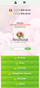 | AI-анализ | The portal RedRose.by is an e-commerce website specializing in the sale of flower bouquets in Minsk, Belarus. Users can place orders by calling the phone numbers provided, with a promise of quick delivery and low prices. The website offers various bouquet compositions, including red roses, chrysanthemums, lotuses, and garnishes. Delivery options include both courier service within Minsk and self-pickup. All flowers and bouquets are carefully packaged in matte paper, foil, or elegant baskets, and the site also sells related items such as balloons and greeting cards. Recommended items include Red Naomi roses for 2.90 rubles, Pic Avlanche roses for 2.50 rubles, and the "Passion" bouquet with 101 red roses for |