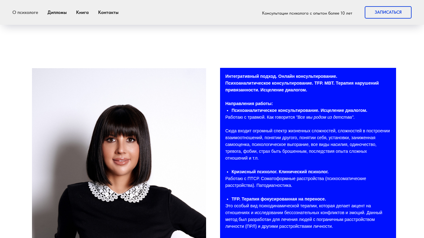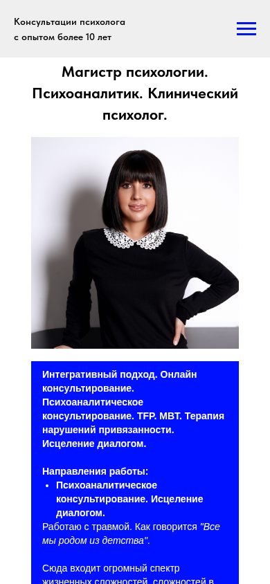 AI-анализ | This online resource is dedicated to the work of psychologist Julia Shvayko. The website provides information about the psychologist's qualifications, experience, and therapeutic approaches. Julia Shvayko holds a Master's degree in psychology and specializes in psychotherapy, psychodiagnostics, and individual counseling. With over 10 years of experience, she offers consultation services in various areas, including psychoanalytic therapy, trauma therapy, and relationship issues. The website mentions her expertise in treating attachment disorders and the use of therapeutic methods such as TFP and MBT. Visitors can learn about her approach to working with clients, which emphasizes the importance of understanding and addressing unconscious conflicts and emotions. The website also features a book for sale, likely related to the topic of her work. |