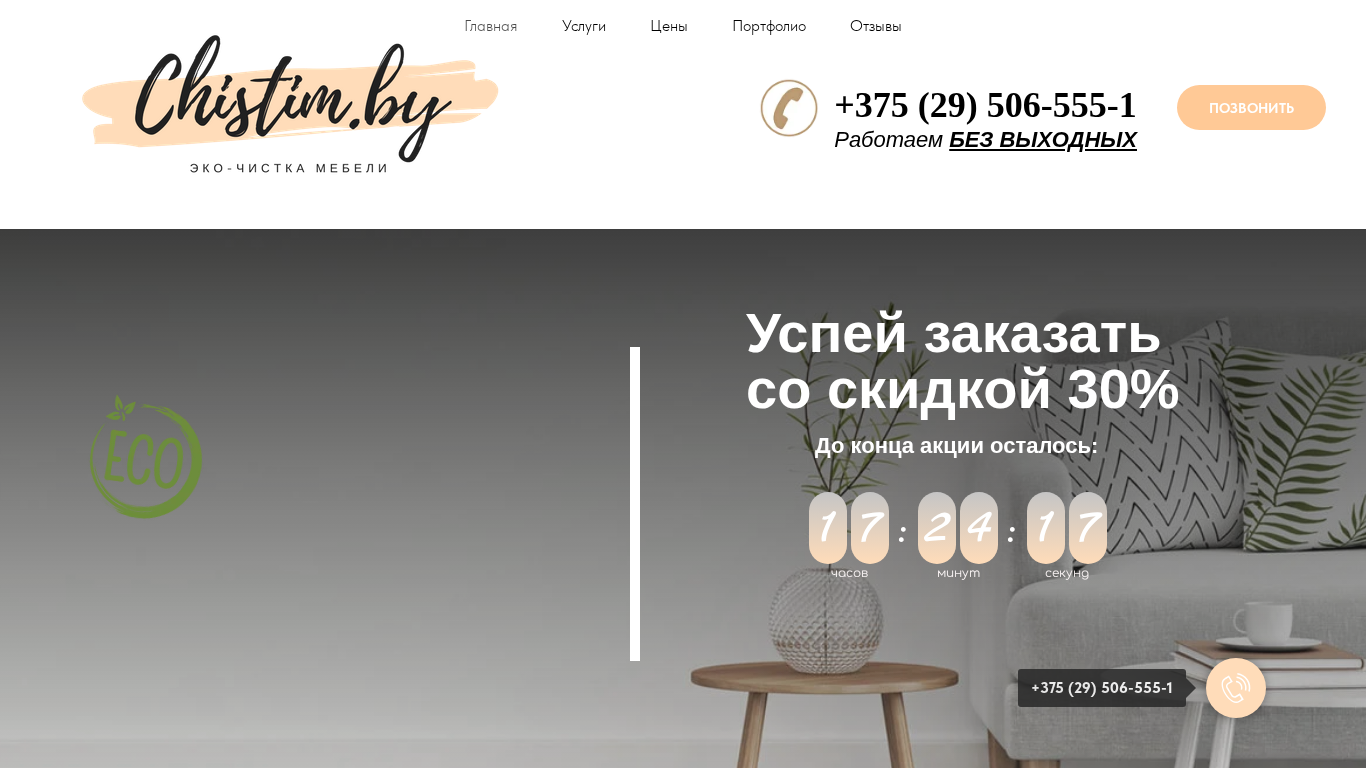 | Название / Заголовок | Химчистка мягкой мебели, диванов и кресел на дому в Минске - цена от 8 руб | Эко Чистка мебели и дивана Минск недорого - Без Запаха | +375 (29) 506 555 1 |