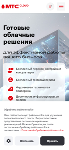 | AI-анализ | The web project "Cloud MTS" offers a range of cloud services and solutions for businesses. Keywords associated with the site include 'cloud', 'security', 'resources', 'data protection', and 'Huawei'. Services provided include Kaspersky and Positive Technologies security systems, audit information security, cryptographic protection, multi-level web application protection, disaster recovery, virtual private server, public cloud for businesses, public cloud based on Huawei, 1C in the cloud, IT outsourcing, corporate email in the cloud, cloud platform for development, cloud SD-WAN, data storage, and backup as a service. Partners, support, FAQ, documentation, pricing, certificates, and articles are also available. The company offers a free trial, consultation, free transfer and setup, and a free test period. Technical support is available at the 4-level. Infrastructure availability is up to |