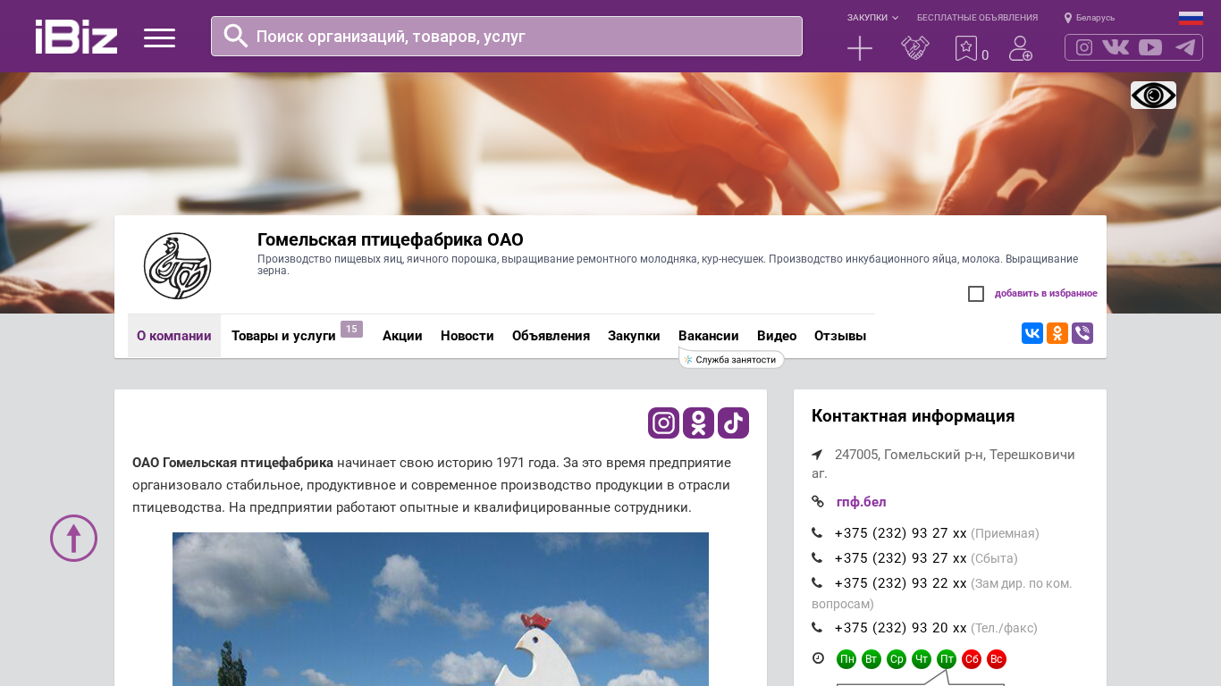 | Название / Заголовок | Гомельская птицефабрика ОАО - Производство пищевых яиц, яичного порошка, выращивание ремонтного молодняка, кур-несушек. Производство инкубационного яйца, молока. Выращивание зерна.. 247005, , Терешковичи аг. |