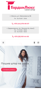 | AI-анализ | This online resource is a curtains and drapery store named 'ГардинЛюкс' (GardinLux). The title of the website is 'Пошив штор - Салон штор «ГардинЛюкс»' (Curtain Making - GardinLux Store). The business operates in both Minsk and Baranovichy, Belarus. The main services offered include custom curtain making, and the store sells various types of curtains for different rooms, including living rooms, children's rooms, kitchens, bedrooms, and public spaces. They also sell drapery accessories and paddings. The store utilizes high-quality equipment for production and guarantees a high level of craftsmanship. Pricing information includes costs for stitching, hemming, adding decorative thread or braid, and adding lace or other embell |