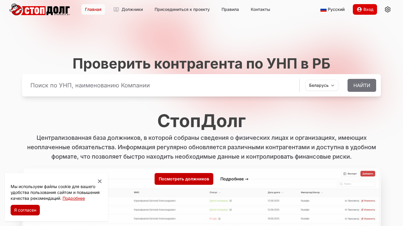 | AI-анализ | --- The web project "StopDolg" is a centralized database of debtors in Belarus, collecting information about physical persons and organizations with unpaid obligations. Data is regularly updated by various counterparties and is available in a convenient format, enabling quick access to necessary information and control of financial risks. The project is supported by several large importers of tools, construction equipment, garden technology, and bench tools in the Republic of Belarus. Its goal is to inform users about unscrupulous business partners, buyers of their products, helping them avoid losses and preventing cooperation with irresponsible leaders and founders of companies, which use their openness and trust to dishonest partners. The project guarantees to the business community that it will not be used as a means of competitive pressure or pressure on partners. Data is entered by a limited number of official importers and can be verified at any time. The table |