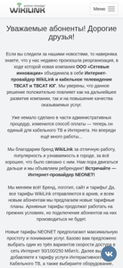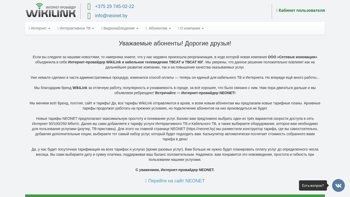 | AI-анализ | The website is a Belarusian internet service provider called WikiLink. The description mentions several services offered, including different internet tariffs for individuals and businesses, Wi-Fi routers and repeaters, interactive TV packages, video surveillance services, and mobile application access. Users can log into a customer portal to manage their account and view information about the company, network performance, and available services. The website also provides contact information, including a phone number and email address. The company name has changed to Neonet as part of a recent reorganization. |