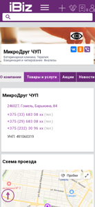 | AI-анализ | The portal is a veterinary clinic named МикроДруг ЧУП, located in Гомель, Барыкина, 84. The website offers veterinary services including therapy, vaccination, and microchipping, as well as diagnostic analyses. The company's contact information is provided, including three phone numbers and the address. The business hours are mentioned as Monday to Friday from 9:00 to 18:00 without lunch breaks. The website is categorized under veterinary services and care for animals in the city of Гомель. |