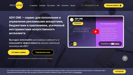 | Название / Заголовок | ADV ONE - управление бюджетами рекламных сервисов - Facebook, TikTok, ВК, Google и Яндекс. |