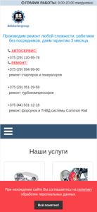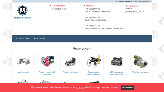 | AI-анализ | The web project BelTurbo is an online store in Minsk, Belarus, for purchasing auto parts with delivery across Belarus. It offers over 15,000 auto parts in stock, VIN selection, and installation services. The company also has its own auto repair shop in Minsk. BelTurbo has been in business for 18 years. Services include auto repair, tire services, and technical maintenance for engines, starters, generators, turbines, and fuel systems. Contact numbers for various repair services are provided. The repair shop is located at Timiryazeva Street 46/5 in Minsk, and its hours of operation are 9:00-20:00 daily. The company guarantees a three-month warranty on repairs. |
