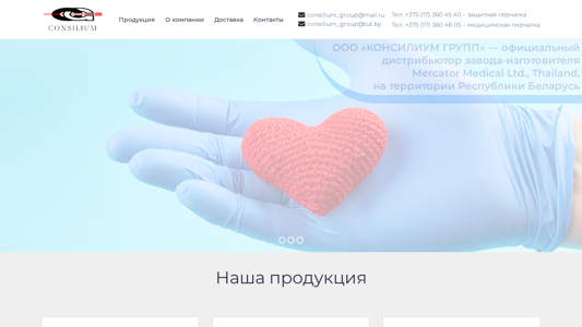 | AI-анализ | This online resource is a consilium group e-commerce website dedicated to selling medical and protective gloves in bulk from the manufacturer with delivery in Belarus at competitive prices. The title of the website is "КОНСИЛИУМ ГРУПП - купить медицинские и защитные перчатки оптом от производителя с доставкой" and the description mentions "качественные нитриловые и латексные перчатки" for purchase in bulk with delivery in Belarus. The website is a distributor for Mercator Medical Ltd., a glove manufacturing company based in Thailand, in Belarus. The company, OOO "КОНСИЛИУМ ГРУПП," was founded in 2007 and specializes in the wholesale sale of gloves for medical institutions, production facilities, and |