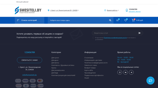 | SEO-описание | Интернет-магазин ✅смесителей, ✅сантехники, ✅раковин и моек, ✅запчастей и расходных материалов для смесителей. Доставка в Минск, Брест, Витебск, Гомель, Гродно, Могилев и другие города Беларуси. |