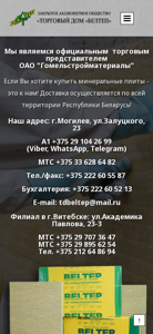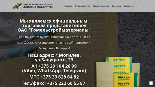| AI-анализ | This online resource is the official e-commerce platform of Belarusian trading company "BelTep" representing the interests of OAO "Gomelstroymaterialy". The website specializes in the sale of mineral plates with delivery available throughout the Republic of Belarus. The company's address is in Mogilev, Ul.Zalutskogo, 23. Contact information includes phone numbers +375 222 60 55 87, +375 222 60 52 13 for the accounting department, MTS +375 33 628 64 82, and A1+375 29 104 26 99 for Viber, WhatsApp, and Telegram. The company also has a branch in Vitsebsk |