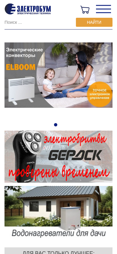 | SEO-описание | Компания Электробум поставляет электрическую технику для дома, дачи, кухни, для красоты и ухода за телом. Прямые поставки от производителей, а так же собственное производство обогревателей в Минске. Продаём оптом и в розницу. Весь товар можно купить здесь, в нашем интернет-магазине. |