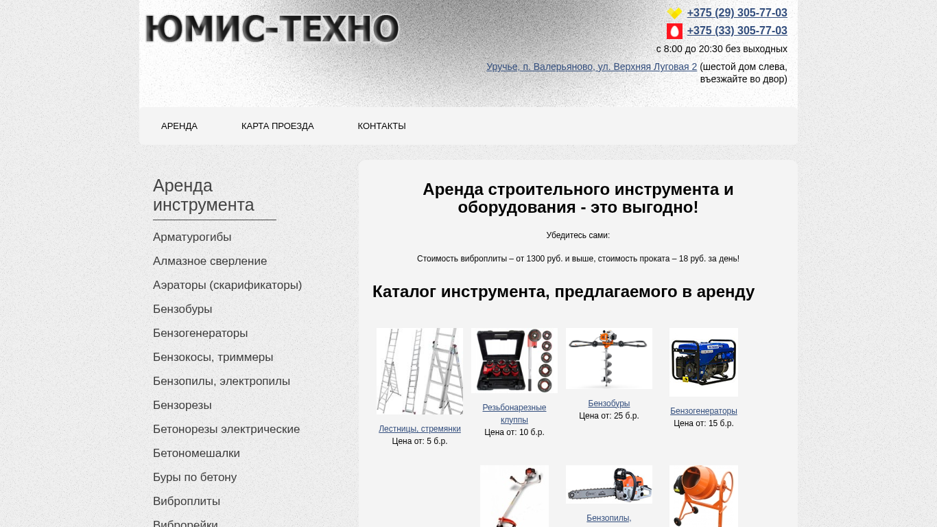 | SEO-описание | «ЮМИС-ТЕХНО» предлагает взять в аренду строительный инструмент и оборудование по выгодным ценам! ☎ +375 (29) 305-77-03. |