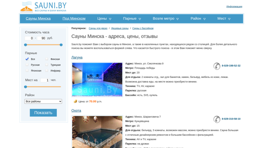 | AI-анализ | The portal Sauni.by is a catalog of saunas and baths in Minsk, featuring a convenient search and comprehensive information about prices, contacts, addresses, and interiors with detailed descriptions. It provides information on various types of saunas, including Russian, Finnish, and Japanese ones, as well as infrared and Turkish baths. The list includes locations near metro stations such as Kamennaia Gorka, Kunetschyna, and others. Prices range from approximately 35 to 70 rubles per hour for various types and sizes of saunas. The website also features reviews, allowing users to make informed choices when selecting a sauna. Sauni.by assists in finding a sauna in Minsk and nearby settlements, offering a detailed search form and a quick search menu for easy navigation. Some featured saunas offer additional amenities such as bill |