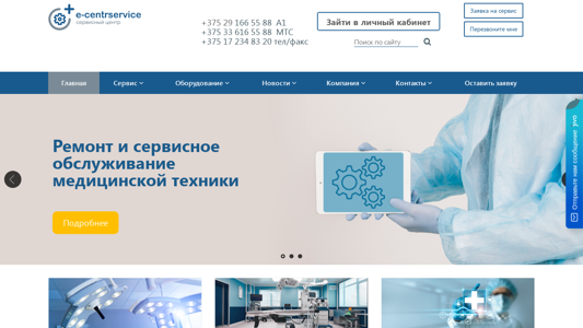 | AI-анализ | --- The web project e-centrservice.by is the main page of a unified service center for the products of E-Medical Group LLC. The keywords associated with this site are marketing, advertising, and branding. The top words include equipment, medical, service, apparatus, repair, obsluzhivanie (Russian for 'servicing'), and after-warranty service. The site offers a list of medical equipment for selection, including categories for repair, diagnostics, service, and training. Visitors can make a service request by filling out a form with their name, phone number, and email address. The contact information for the service center includes three phone numbers and a link to a personal cabinet. The site also provides information on various types of medical equipment, including those for sleep studies, respiratory support, cosmetology, ophthalmology, and physiotherapy, as well |