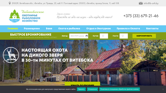 | SEO-описание | Загородная база отдыха "Бабиновичское ОРХ". Уютные лесные домики для семейного проживания. Русская баня на дровах. Охота на дикого зверя. Рыбалка и Экотуризм. |
