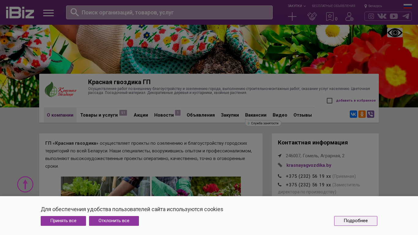 | Название / Заголовок | Красная гвоздика ГП - Осуществление работ по внешнему благоустройству и озеленению города, выполнению строительно-монтажных работ, оказание услуг населению. Цветочная рассада. Посадочный материал. Декоративные деревья и кустарники, хвойные растения.. 246007, Гомель, , Аграрная, 2 |