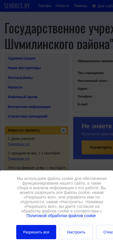 | AI-анализ | This website is the official website for the State Institution "Physical and Recreational Center of Shumilino District" located in Belarus. The website uses cookies for site functionality and data collection and analysis. Visitors can allow all cookies or manage them individually, with an option to withdraw consent at any time. The site includes a section on the use and management of cookies, as well as a policy on cookie handling. The domain is fokshumilino.schools.by. |
