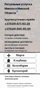| AI-анализ | --- This online resource is a funeral service provider in Minsk and the Minsk Region, known as B-ritual. The website offers a range of ritual services, including funeral arrangements, burial services, and cremation. Users can also find a catalog of VIP funeral services, VIP halls, and reviews. The contact information includes phone numbers for two different contact points and a government registration number. The website also mentions discounts for 11 months and a list of required documents and procedures for organizing a funeral. The website produces its own coffins and wreaths and has its own transport fleet, allowing it to offer lower prices. The services offered include transportation of bodies, burial in different locations, the provision of ritual items, and the organization of ceremonies and receptions. The website also offers VIP funeral services and the opportunity to order a draped coffin, a lacquered |