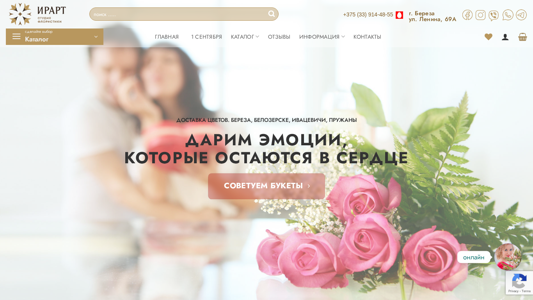 | AI-анализ | --- The website 'Цветы Береза - Доставка Цветов в Березе' is an online florist store based in Bereza, Belarus. It offers a wide range of fresh flowers, bouquets, and flower arrangements for delivery within the city at affordable prices. Customers can purchase flowers online or place a rush order. The store claims to be the best florist in the city. Delivery starts from 70 rubles, and there is an option for free delivery on certain purchases. The website also provides a catalog for upcoming holidays and events, such as '1 сентября' and 'Цветы на 8 марта'. Some flowers are currently on sale with discounts up to 11% off. The store allows customers to save their favorite bouquets for future purchases. The website is available at irart.by. |
