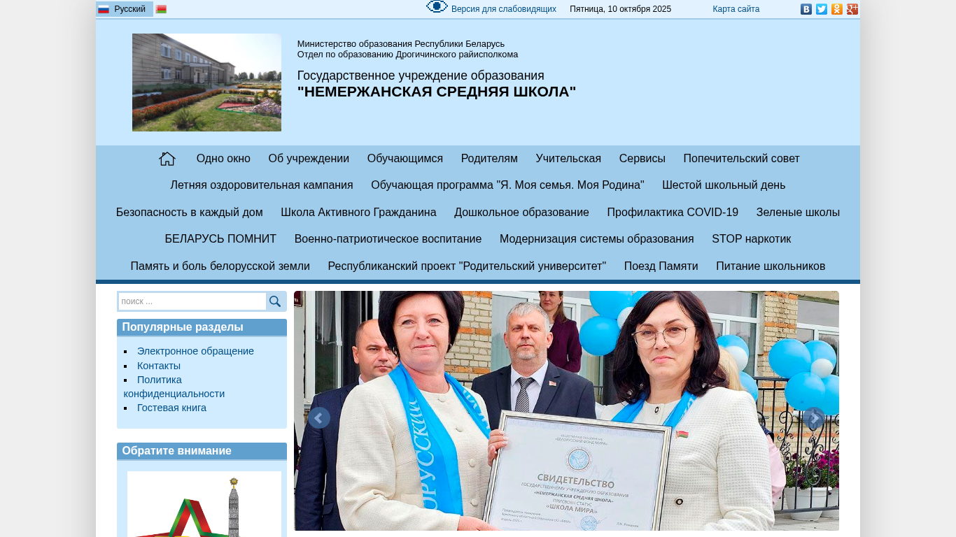 | AI-анализ | --- The web project "Немержанская СШ" (nemerja.drogichin.edu.by) is a website for the State Educational Institution "НЕМЕРЖАНСКАЯ СРЕДНЯЯ ШКОЛА" (Nemerjanskaia Sredniaia Shkola) located in Drohichyn, Brest Oblast, Belarus. The website is operated by the Ministry of Education of the Republic of Belarus and the Drohichyn District Executive Committee. The site includes information about the school, its educational programs, and various initiatives. Some sections are popular, including those related to the "J. My Family. My Homeland" educational program, the "School of Active Citizen," and "Safety in Every Home." The site also features a section for parents, |
