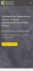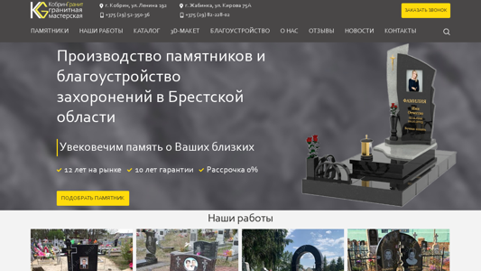 | AI-анализ | This website is dedicated to the production and sale of memorial monuments and cemeteries improvement services in the Brest region of Belarus. The title of the website is "Manufacturing monuments in Cobrin, Zhabyanka". The description states that there is a wide catalog of monuments for sale at producer's prices, including single and double monuments, as well as children's and complex memorials. The website offers 3D-models, bлагоустройstvo (improvement) services, and a contact form for inquiries. The website also mentions their 12-year history in the market and a 10-year guarantee on their products. The website has a section for their services, including various types of monuments and gravestones, as well as installation and removal services. The website also offers a wide range of granite types for monument production. The |