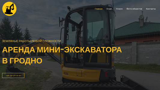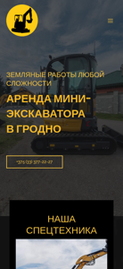 | AI-анализ | --- This website is for renting a mini excavator in Grodno, Belarus. The homepage features information on land excavation services of various complexities, with a focus on the rental of a specific XCMG XE 35U mini excavator model. The contact number is provided for inquiries and bookings, and the equipment specifications are given, including its weight, dimensions, and capabilities. The services offered include excavation of trenches, digging of pits, and ground levelling, among others. The website also mentions the availability of a hydraulic breaker, a yam burrow, and a claw digger for additional tasks. The company works round the clock and serves both individuals and organizations, with various payment options and competitive pricing. The website includes a menu with pages for 'About Us', 'Services', 'Photos of Objects', and |