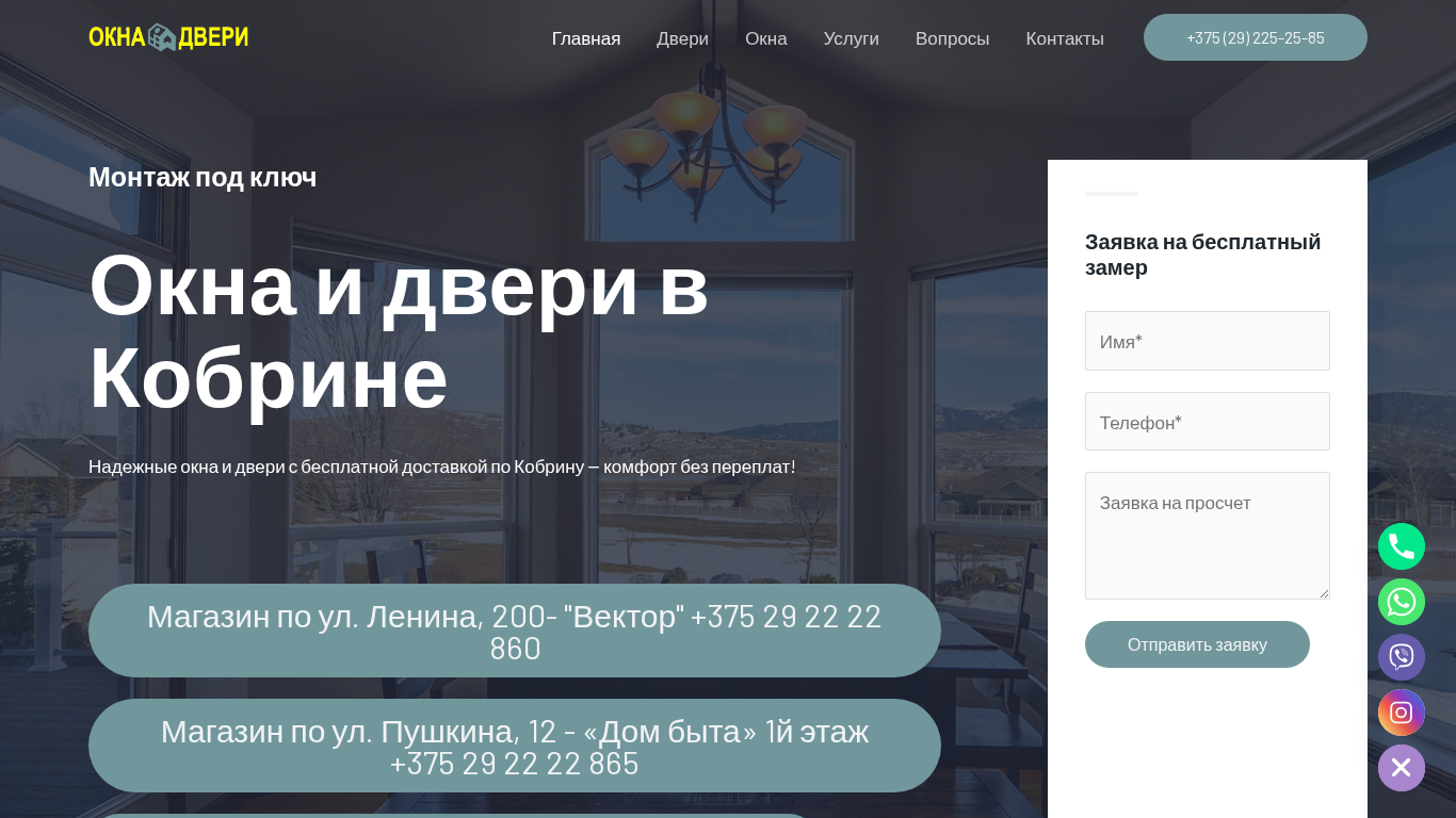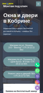 | AI-анализ | The web project "Okna Dveri Kobrin.by" is an e-commerce website selling and installing windows and doors in the city of Kobrin, Belarus. The website offers reliable windows and doors with free delivery and installation in Kobrin. There are two physical stores located at ul. Lenina, 200 - "Vector" and ul. Pushkin, 12 - "Dom Byta" 1st floor. The website provides services for PVC window and door repair, and customers can place orders and consult with specialists at these locations. The website also offers financing options, including a three-month no-interest payment plan and a credit from 12 to 36 months. The website sells various types of windows and doors, including budget options and premium ones, with options for panoramic, arched, triangular, round, laminated, and |