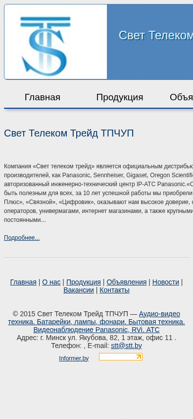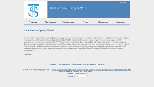 | AI-анализ | url: http://svet_telecom_trade.informer.by/ The web project 'Свет Телеком Трейд ТПЧУП' is a distributor of telecommunication products, household appliances, and electronics from renowned global manufacturers such as Panasonic, Sennheiser, Gigaset, Oregon Scientific, BBK, and Motorola. The company focuses on the engineering sector and is an authorized engineering and technical center for Panasonic IP-ATS. Established in 2003, the company's philosophy is that business should benefit everyone. With a decade of successful operation, it has amassed a large clientele and partnership base, including companies like 'Корона-Техно', '5 элемент', 'Техно Плюс', 'Связной', 'Цифрови |