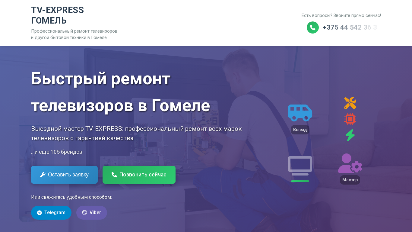 AI-анализ | The web project TV-EXPRESS Гомель offers a professional on-site repair service for all television brands in the city of Goemei (Goemel, Гомель) and its surrounding regions, including Central, Sovietsky, Zheleznodorozhny, Novobelitsky, Frunsensky, Kirpichny, and Sel'mashsky districts, as well as the villages of Chyonki, Uritskoye, Yereymino, Bobovichi, Kostyukovka, Ulukovye, Novaya Gutha, Krasnoye, Poiklyubichy, Cheretyanka, Koren'evka, Staryye Diatlovichi, Novye Diatlovichi, Uza, Terekhovichi, and Borovaya. The company specializes in quick diagnosis and high-quality |