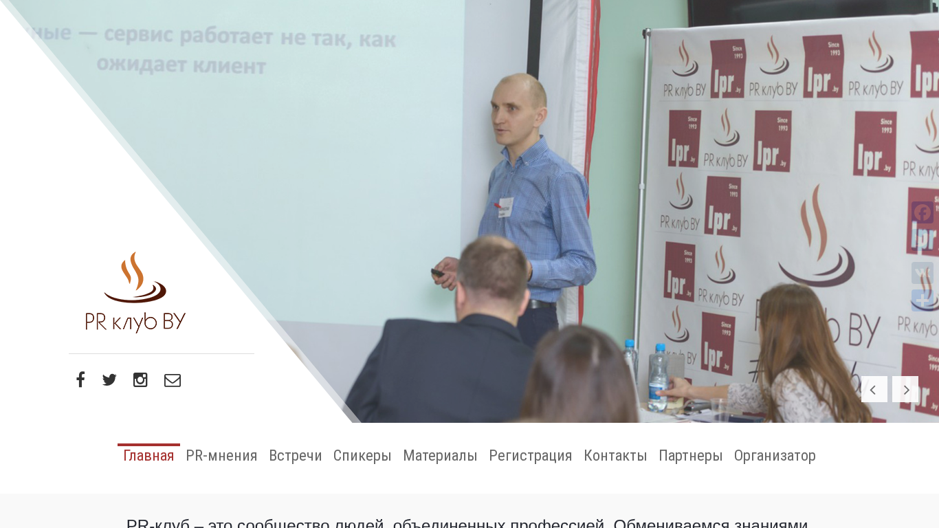 | SEO-описание | PR-клуб в Беларуси – это место встреч профессионалов в сфере коммуникаций. Цель PR-клуба – развивать новые для Беларуси бизнес-инструменты, создающие репутацию белорусскому и международному бизнесу. Участники PR-клуба – PR-менеджеры, пресс-секретари, директора по коммуникациям, маркетологи, ТОП-менеджеры. Каждая встреча посвящена теме, отвечающей на вопрос: Как PR может решать стратегические актуальные вопросы бизнеса? Встречи PR-клуба проходят с 2006 года. Организатор PR-клуба – консалтинговая компания IPR Belarus. |