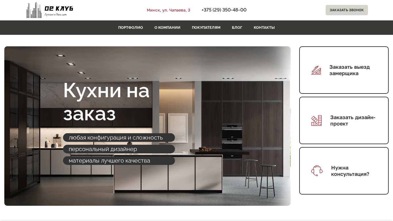 | SEO-описание | Купить кухню на заказ - D2 Клуб. Кухни любой сложности и конфигурации. Высокое качество и выгодные цены. Скидки⭐ Рассрочка ⭐ ЗВОНИТЕ! +375 (29) 350-48-00 |