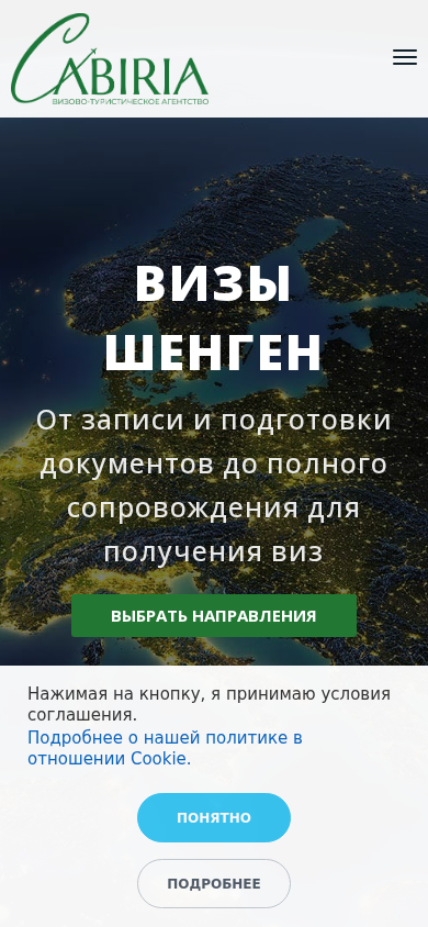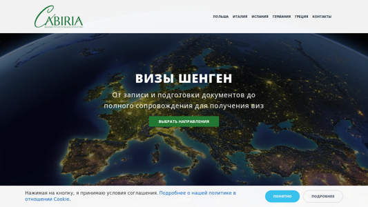 | AI-анализ | --- The web project "Cabiria.by" is a visa center providing services for obtaining visas for Poland, Italy, Spain, Germany, and Greece. The website offers assistance in the preparation of documents and application process for various types of visas, including national visas (Type D) and Schengen visas (Type C). The visitors can choose their preferred destination and method of application, either personal or courier service. The prices for services range from 300 BYN for national visas in Poland to 650 BYN for Schengen visas in Spain. The website also includes a section on the cooperation process, outlining the steps from initial consultation to document preparation and visa center registration. |