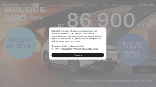 | AI-анализ | This online resource, titled "BELGEE Атлант-М: Купить авто Белджи в Минске - цены на автомобили Belgee в Беларуси" (BELGEE Atlant-M: Buy Belgee cars in Minsk - prices for Belgee cars in Belarus), is an official dealer website for Belgee automobiles in Minsk, Belarus. With over 30 years of experience, the website offers a wide selection of new Belgee models, including S50, X50, X70, X80, and PHEV, with prices starting from 52,900 BYN for S50, 61,900 BYN for X50, 72,900 BYN for X70, 7 |