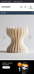 | AI-анализ | --- The portal OKOPRINT is an online store specializing in 3D printing and 3D printed decor. The site offers various items like vases, cash registers, lamps, organizers, holders, and gifts. All products are made in Minsk, Belarus, using materials such as PLA, PETG, and ABS for precise printing. Delivery is available within Belarus, Russia, and the CIS countries. The site includes a contact number, email for authorization, and an option for a callback. Categories include art, home accessories, and seasonal decorations, such as Halloween items. Product listings include detailed descriptions, prices, and a 'Buy' button. |