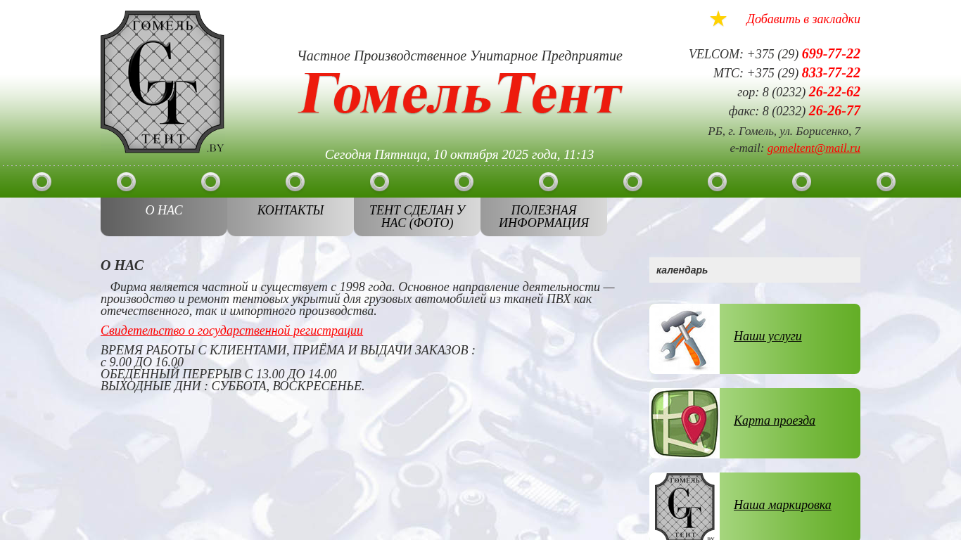| AI-анализ | This website is for a private production unit enterprise named "ГомельТент" based in Belarus, specifically in the city of Гомель. The company has been in operation since 1998 and specializes in the production and repair of tent covers for cargo vehicles using PVC fabric, both domestic and imported. The website provides contact information, including phone numbers for VELCOM and MTS, a local number, and a fax number. The email address is gomeltent@mail.ru. The business operates from 9:00 to 16:00, with a lunch break from 13:00 to 14:00. Weekends are the days off. The calendar section indicates services offered, a map for location, the company's mark, and an option to place an order. The company registration number is UNN 49055 |
