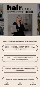 | AI-анализ | --- The web project "Hair-Code.by" offers various courses on hair coloring for hairdressers in Minsk, Belarus. The main content can be accessed through the "Курсы" section on the homepage, which leads to pages for offline and online courses on the basics of coloring (LEVEL 1) and complex techniques (LEVEL 2). The website also provides an online course on quick coloring schemes (Airtouch Pro), a course on hair reconstruction, and an opportunity to register as a model. Users can find contact information, payment details, and reviews on the "Контакты" page. The business is a private enterprise named "Хаир-Код" with the Unified State Register of Enterprises number 193708950, located at ul. Slavinskogo 45A, apt. |