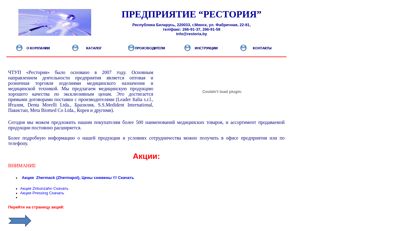 | Название / Заголовок | РЕСТОРИЯ - оптовая и розничная торговля изделиями медицинского назначения и медицинской техникой для стоматологов |