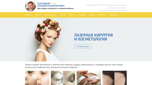 | AI-анализ | The portal is a medical website dedicated to laser surgery and cosmetology services provided by Dr. Potroyny Arkadiy Vladimirovich, a surgeon-specialist in laser medicine. The site includes information about the doctor, his office location and contact details, as well as descriptions and photos of various laser treatments offered, such as the removal of pigmented spots and scars, fractional rejuvenation, and laser epilation. The site also features patient reviews and articles on laser medicine and its applications. The domain is registered to the medical center "Kravira" and is located on ul. Zakharova 55 in Minsk, Belarus. |