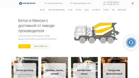 | AI-анализ | This website is a building materials supplier specializing in concrete and related products in Minsk, Belarus. The title of the website is "Quality Concrete in Minsk from the Manufacturer - ☭ Gost." The description mentions affordable prices, daily delivery, and a royal approach to each customer. The top keywords include "concrete," "order," "concrete mixture," "cheap," "delivery," "Minsk," and "price." The website offers various types of concrete, including anti-freeze concrete, concrete for foundations, and concrete for floors. It also sells cement mixtures and dry materials like gravel, sand, and pebbles. The contact information includes phone numbers for ordering and inquiries. The domain name is kub-beton.by. |