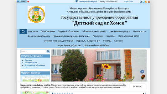 | AI-анализ | This website is a government educational institution website in Belarus with the title "Детский сад д.Хомск" (Children's Garden of Homsk) and description "Государственное учреждение образования 'Детский сад аг.Хомск'" (State Educational Institution "Children's Garden of Homsk"). The keywords and top_words indicate that the website primarily focuses on the children's garden and its offerings, including education, news, and contacts. The website uses cookies and is available in both Russian and an undisclosed alternative language. The website includes sections on the institution's history, mission, and services, as well as contact information, popular topics, and a poll for user feedback. The website was opened in 1983 and has a project capacity of 110 students, with an address in the agro- |