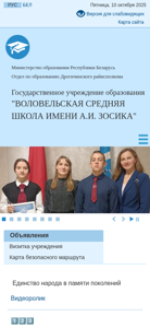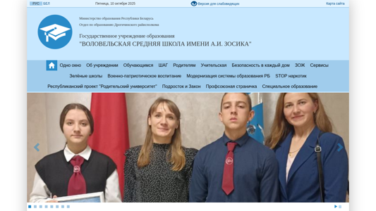 | AI-анализ | The portal "Воловельская СШ" (volovel.drogichin.edu.by) is a website for the State Educational Institution "ВОЛОВЕЛЬСКАЯ СРЕДНЯЯ ШКОЛА ИМЕНИ А.И. ЗОСИКА" (Volovel'skaya Srednaya Shkola Imeni A.I. Zosika). The website contains information about the school's schedule, administration, enrollment procedures, and various educational programs. Keywords associated with the site include "education," "school," "schedule," and "enrollment." The top words are "2025," "read," "further," "republic," "year," "pr," "colors," "site," and "Belarus." The website is managed by the Ministry of |