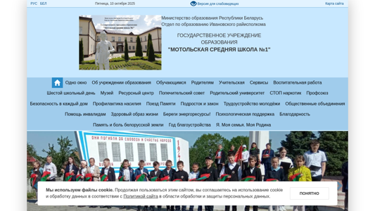 | AI-анализ | The portal "Мотольская средняя школа Ивановского района" (Motol'skaya srednyaya shkola Ivanskogo raiona) is an educational website for a secondary school located in the Ivansky District of Belarus. The website contains information about the school, its classes, news, and safety measures. Users can choose the Belarusian language for the content. The website uses cookies and requires consent for data processing according to its privacy policy. The text is written in a standard font size, with a standard inter-letter spacing. The color scheme is white with black text. Images are enabled. There are no additional features mentioned. The domain is "mot.ivanovo.edu.by". |